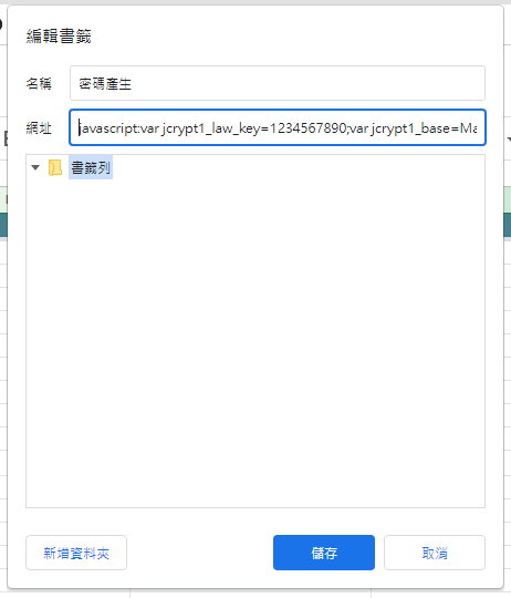 即可在瀏覽器的書籤列產生一個「按鈕」,只要按下他,然後輸入一個「字串或者數字」,即可產生一組密碼,用來申請帳號、設定帳號用途,